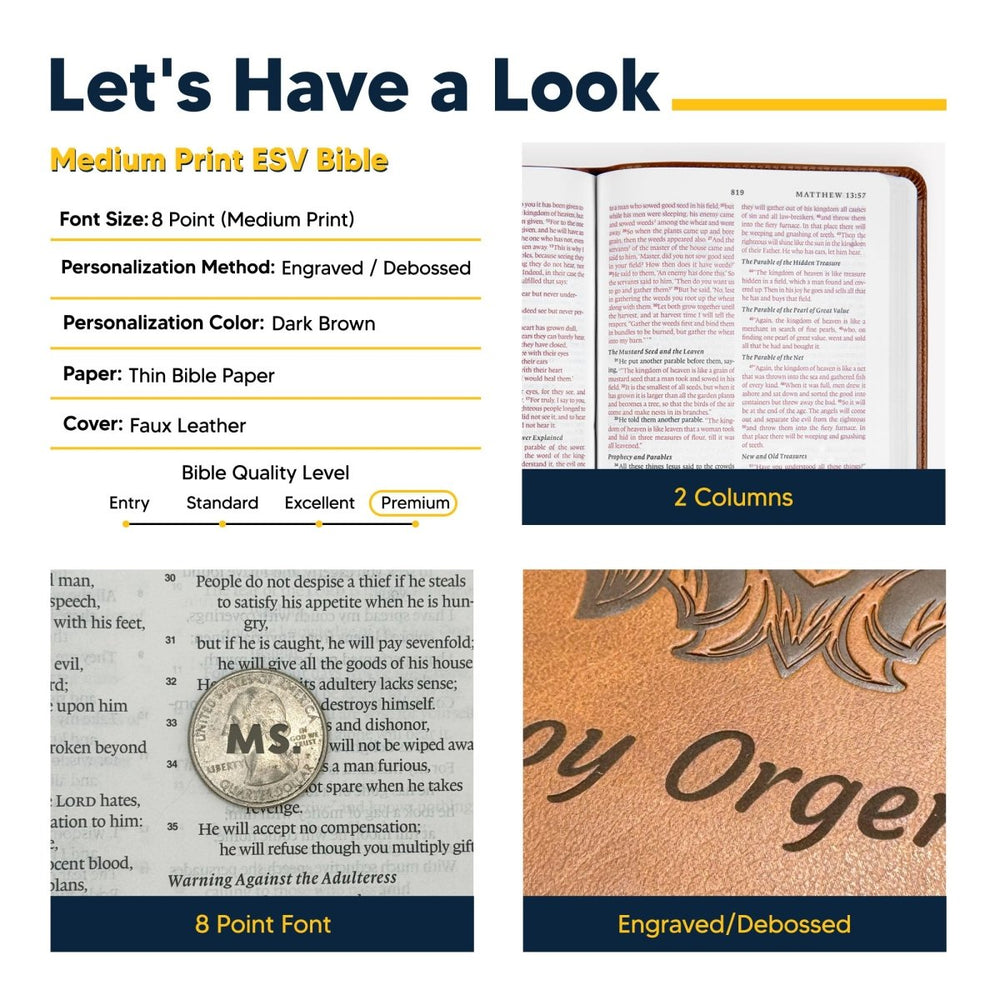 PERSONALIZED: Customize this ESV Bible with up to 1 row that can be a name, date, or special message, complete with full-color maps, ribbon marker The engraving is done on the front below the design and the engraving color is brown/dark brown