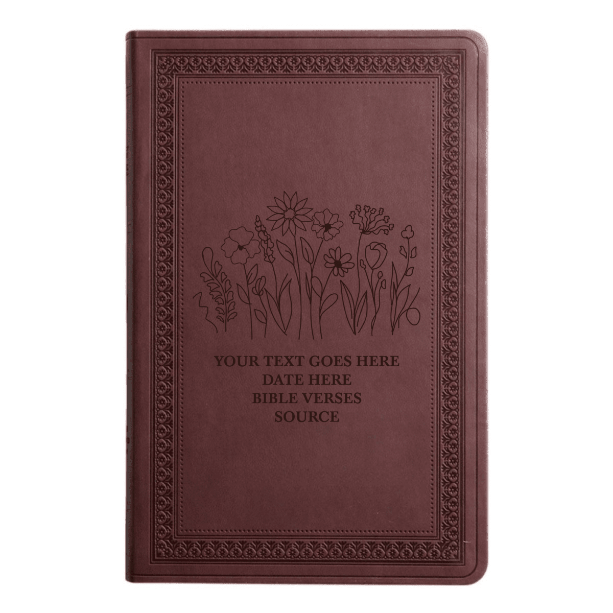 CUSTOM DARK PLUM ENGRAVING: Beautiful dark brown of your name on elegant plum bible cover with bordered edges to create a meaningful, personalized Bible perfect for gifts or daily use