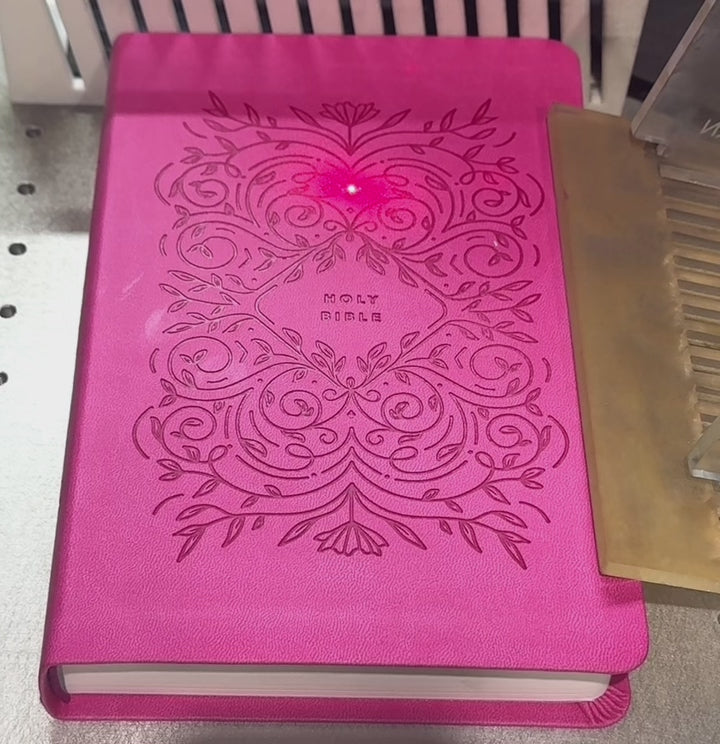 DESIGN: Experience the beauty of the New Living Translation Bible in a personalized faux leather cover with a stunning pink vine design The engaving is on the bottom as the pink vine design takes up most of the cover