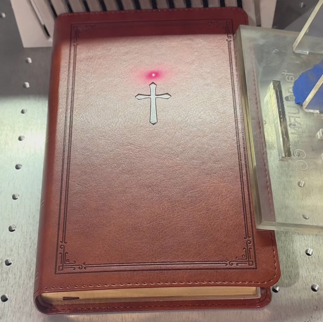 Personalized Dark Brown Inscription: Custom name and date expertly laser-engraved in matching dark brown on premium brown faux leather featuring a classic cross and bordered design for a truly unique keepsake