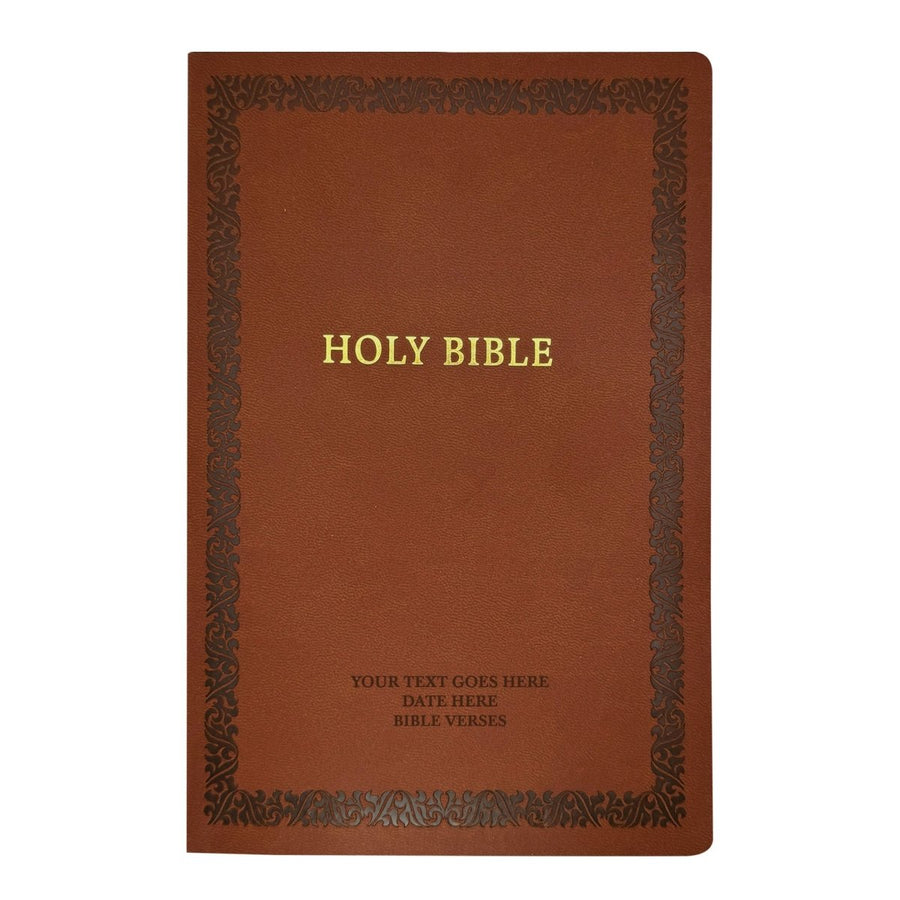 PERSONALIZED: Customize your brown FAUX LEATHER Bible with up to 3 rows of text engraved in dark brown, or choose to add a pre-made icon, making it a ideal and meaningful gift or personal possession