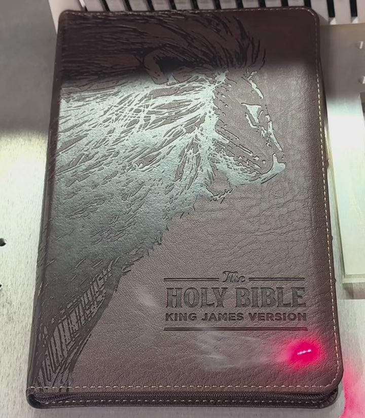 PERSONALIZATION: This KJV Deluxe Bible features a walnut-brown faux leather cover embellished with a heat-debossed lion face design and spine title, creating a visually pleasing aesthetic. Elevate its significance by personalizing it with a name, date, or special text, transforming it into a meaningful and cherished gift.