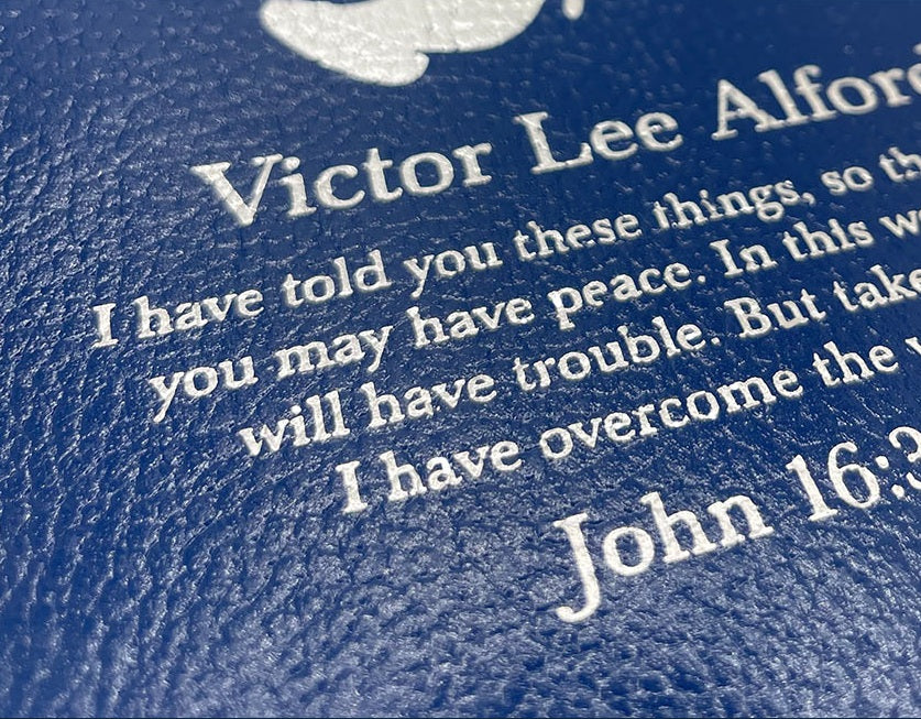 PERSONALIZATION EXPECTATIONS: This basic small print everyday Bible offers average quality (don't expect the highest standards) and is suitable as a good first starter Bible Personalize your KJV Bible with a special memory or note, and choose from our pre-made Icons or add a Name and Date, all beautifully imprinted in silver on the blue cover The price includes the personalization