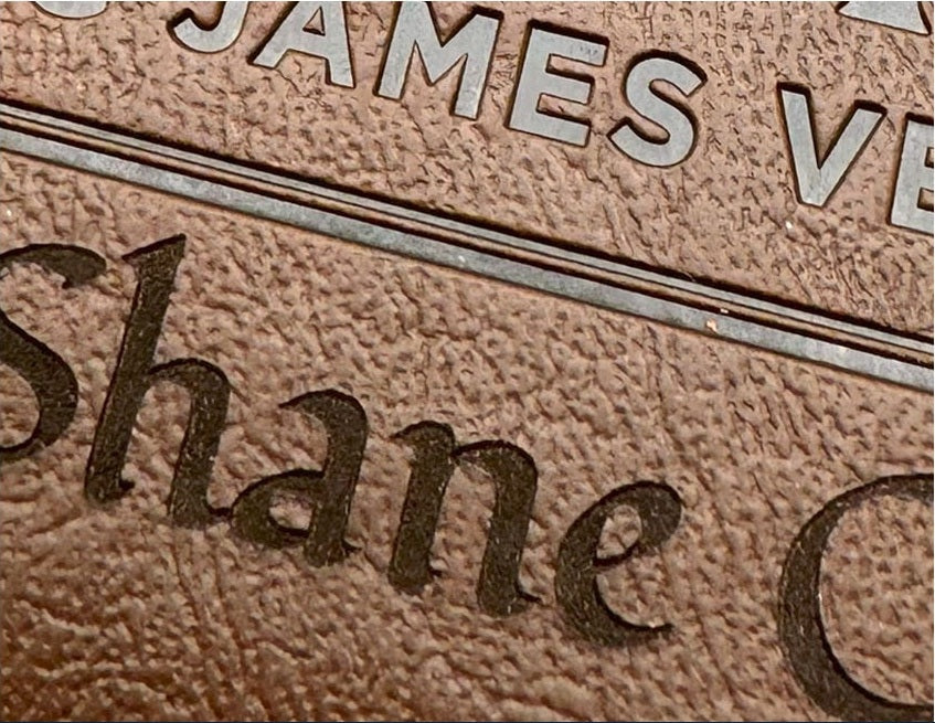- Walnut-brown faux leather cover with heat-debossed lion face design