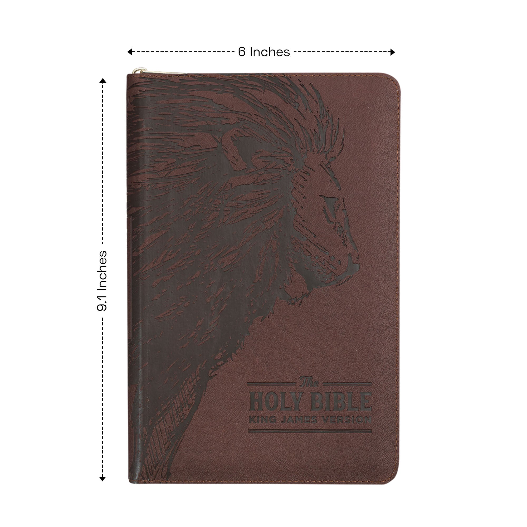 PERSONALIZATION: This KJV Deluxe Bible features a walnut-brown faux leather cover embellished with a heat-debossed lion face design and spine title, creating a visually pleasing aesthetic Elevate its significance by personalizing it with a name, date, or special text, transforming it into a meaningful and cherished gift