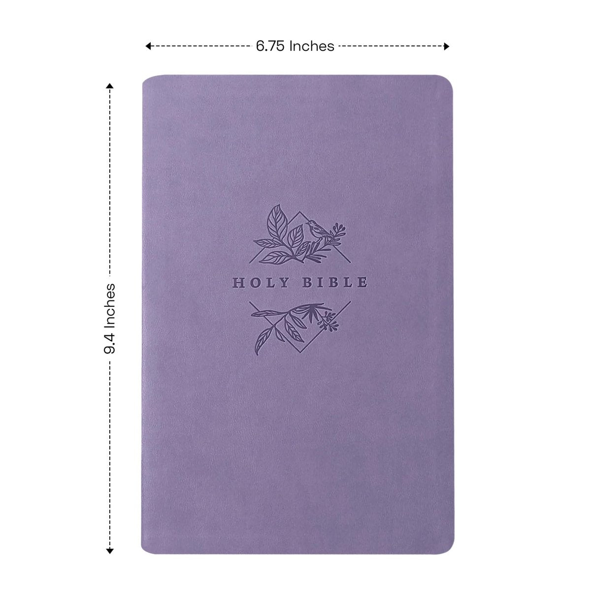 Readable & Durable: Measures approx 95" x 675" bound in a luxurious FAUX LEATHER purple cover with the words Holy Bible on the front and Matthew 6:26 on the back, 2 Column Format, 1049 THIN Bible pages and a LARGE 1025 point font size