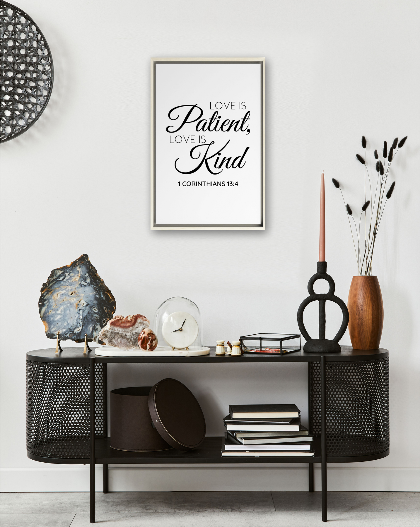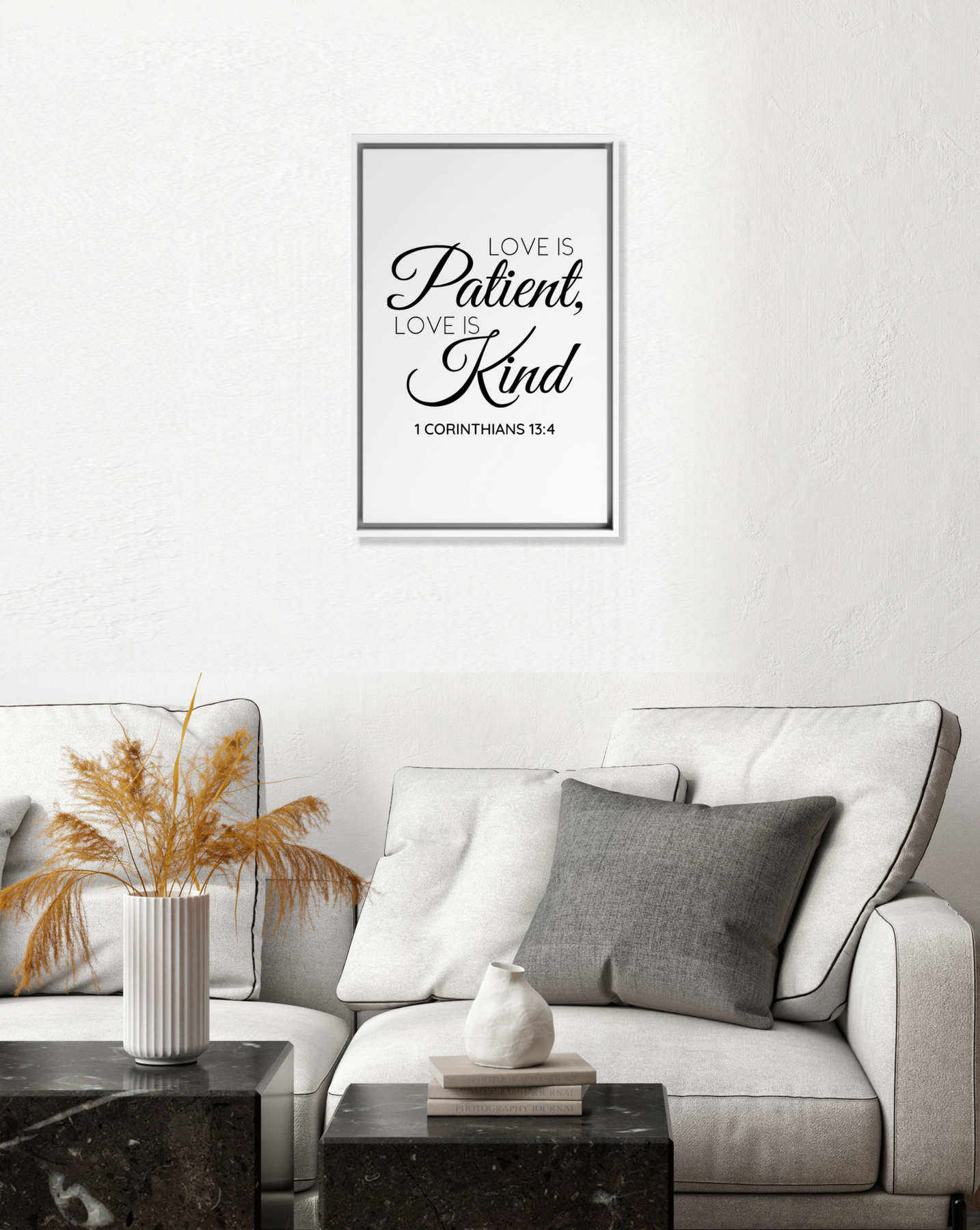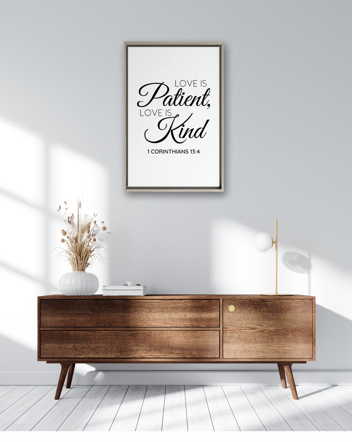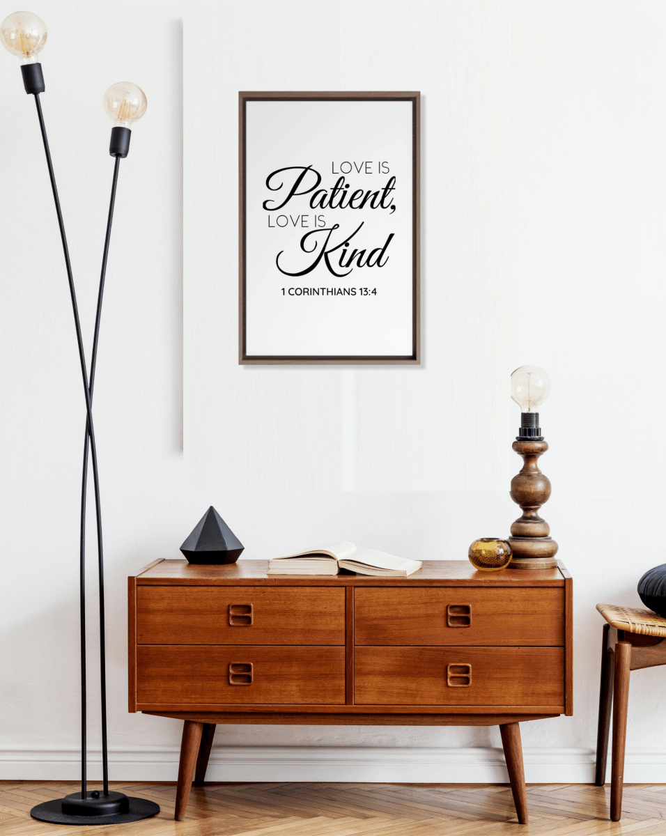 Celebrate the timeless beauty of love with the 1 Corinthians 13:4 Framed Canvas, featuring the powerful words: “Love is patient, love is kind.” This scripture artwork brings a message of compassion, humility, and grace into any room, making it a meaningful addition to your home or a thoughtful gift for weddings, anniversaries, or special occasions.